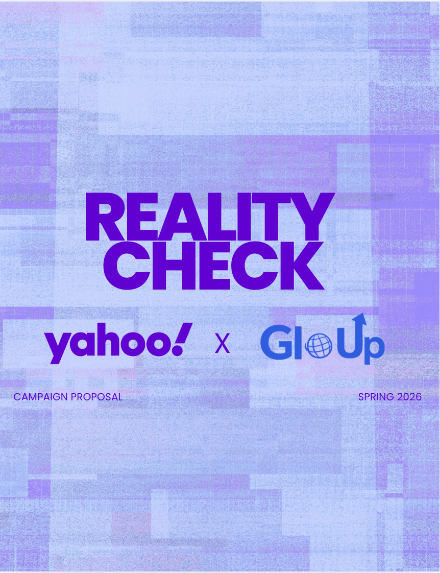 In my capstone course this semester, we worked in teams to develop a full-scale campaign for a real client. As part of GloUp—an agency focused on elevating brands—we partnered with Yahoo to create a strategy aimed at repositioning Yahoo News for a Gen Z audience. The concept centers on restoring trust in a fast-moving digital landscape by positioning Yahoo as a credible, clarifying source in the moment between seeing and believing.